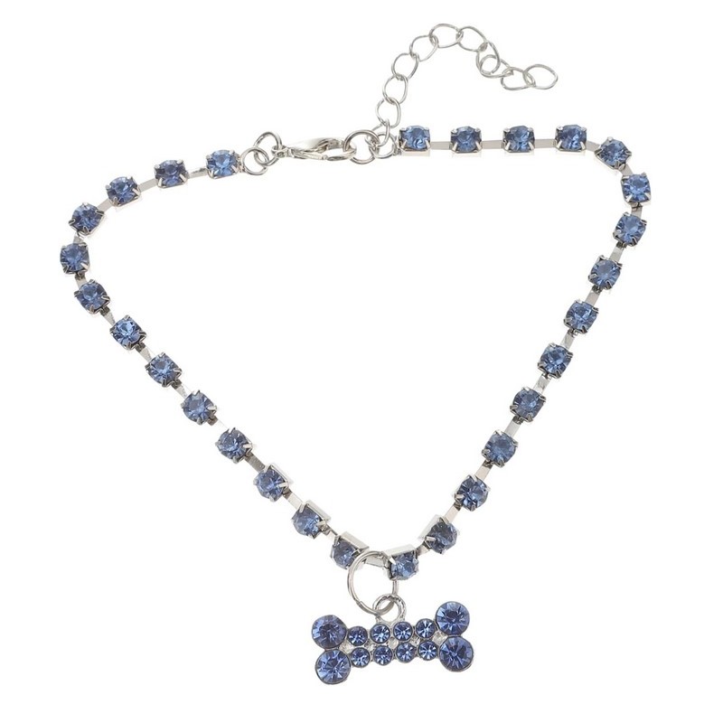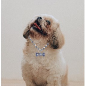 Colier pentru animale de companie, echipat cu un pandantiv in forma de os, decorat cu strasuri. Este potrivit pentru pisici si caini de talie mica.