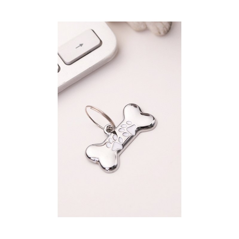 Pandantiv metalic din aliaj de zinc in forma de os, cu amprenta labute gravat cu nume si numar de telefon, 3x1.5 cm
